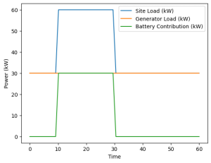 From the generator’s perspective, the load appears flat and stable. From the site’s perspective, full power is still available when required. In graphical terms, as shown in the diagram below – instead of seeing a load curve that rises sharply to 60 kW, the generator load rises to 30 kW and remains flat, while the battery supplies the difference.  The graph illustrates how a BES system reshapes site demand by removing short-duration peaks from the generator load.